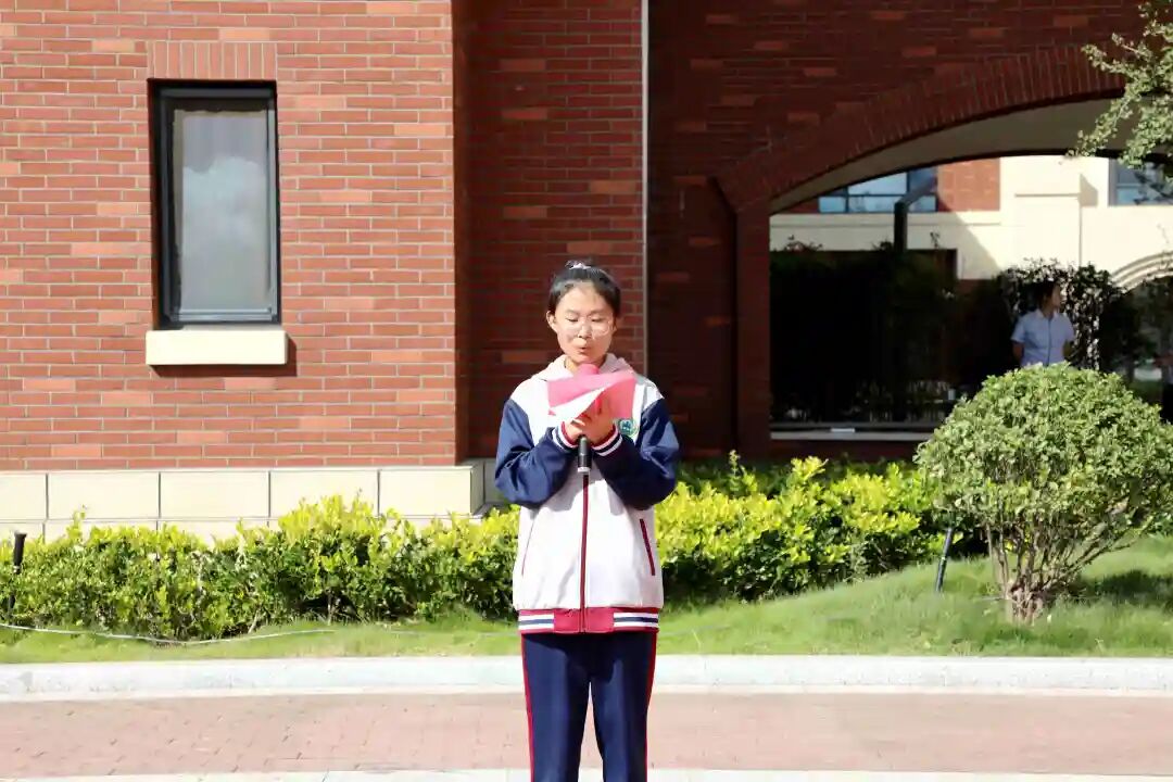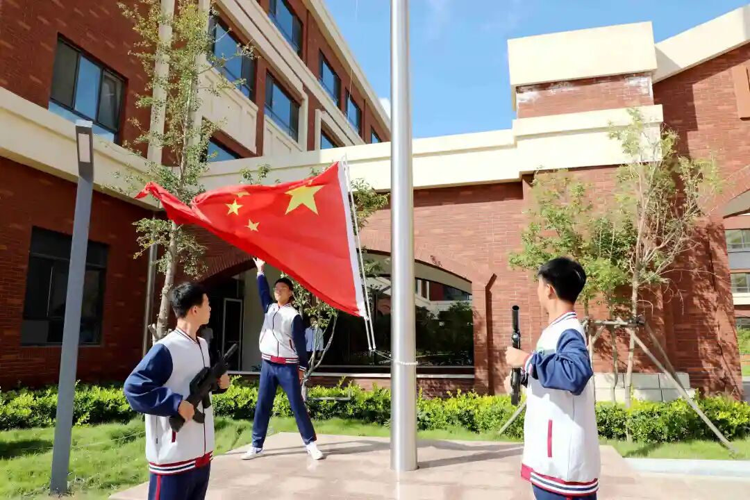 9月28日上午,青岛昌乐二中高级中学全体师生齐聚操场举行第五周升旗仪式,国旗护卫队的旗手们迈着矫健的步伐,护着鲜艳的五星红旗入场。伴着《义勇军进行曲》的响起,全体唱国歌、行注目礼,庄严肃穆。