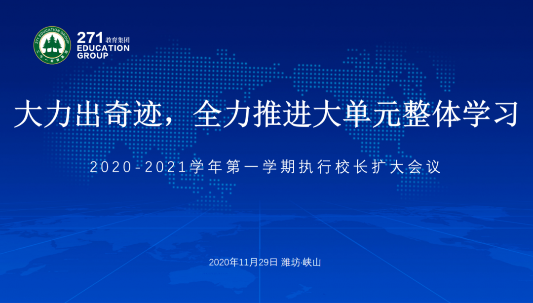 11月29日晚,271教育集团召开2020-2021学年第一学期执行校长扩大会议,大会主题是“大力出奇迹 全力推进大单元整体学习”,大会采用视频会议方式召开,集团17所学校600余名干部参会,会议由集团副校长刘树忠主持。