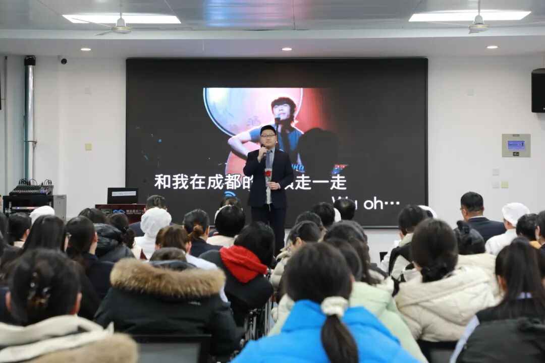 谭力铭老师深情演唱的歌曲《成都》,悠扬的歌声让现场氛围迅速升温。随后,双职工男老师们带来的诗朗诵《春风十里,不如讲台上的你》,用真挚的话语礼赞女老师们的辛勤付出,字里行间满是敬意与感恩。